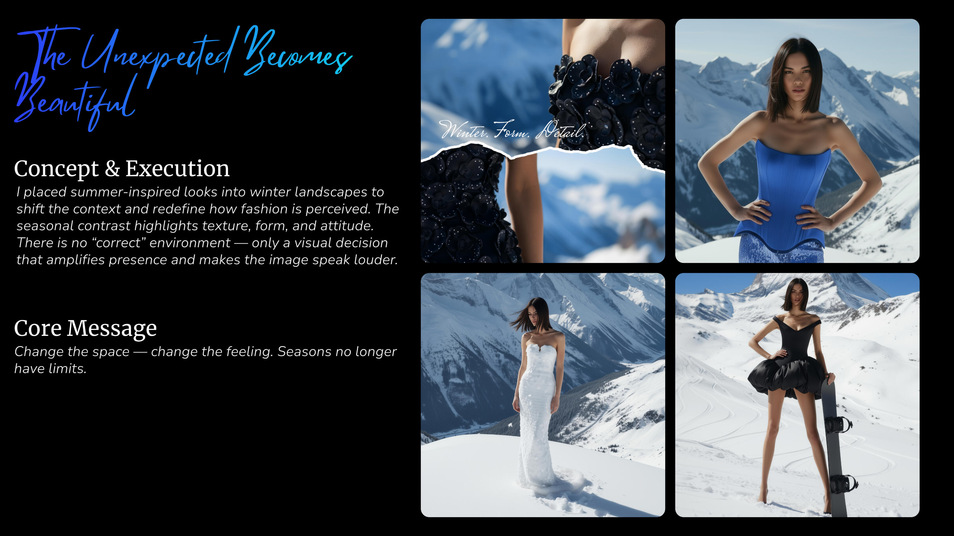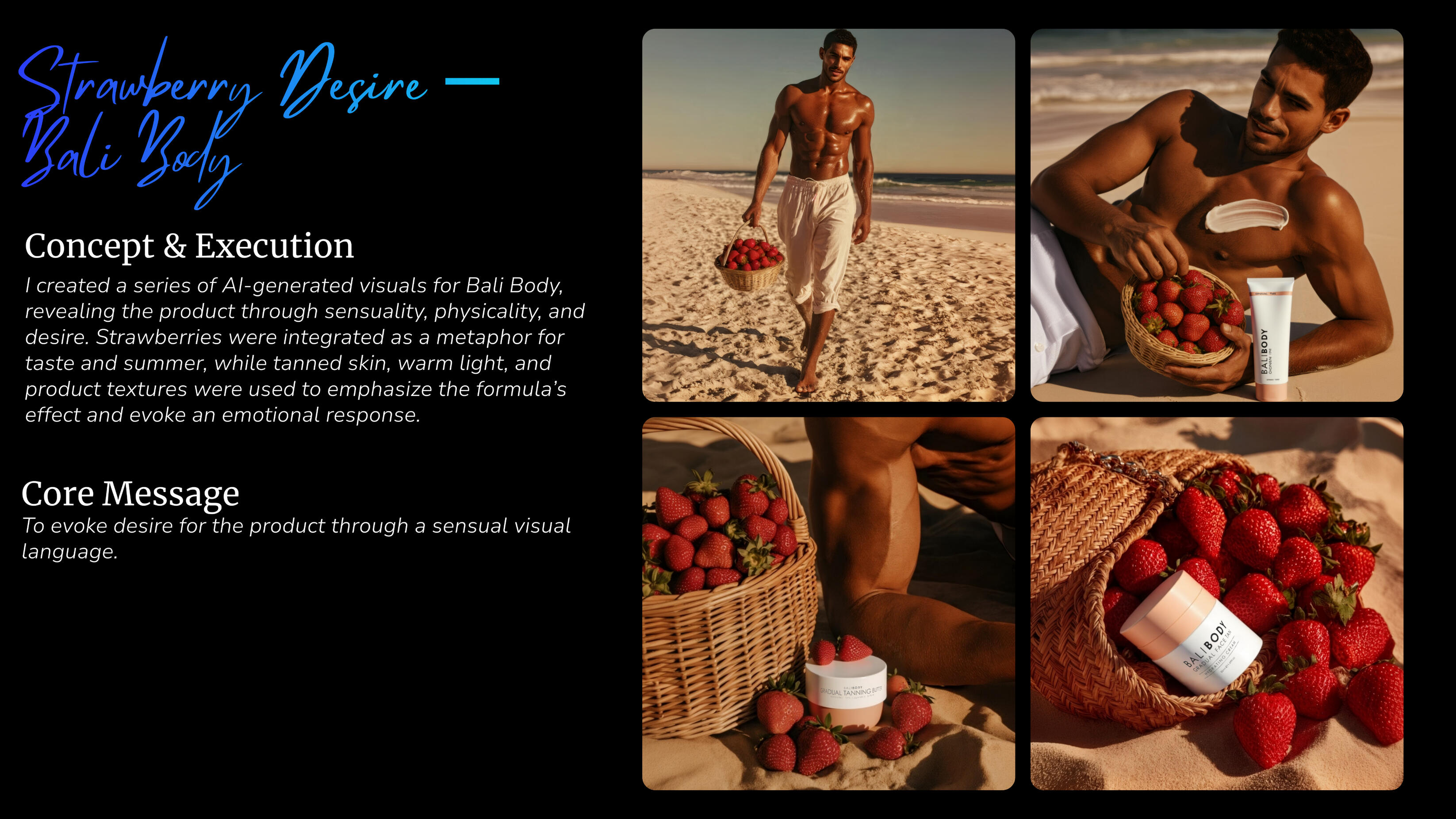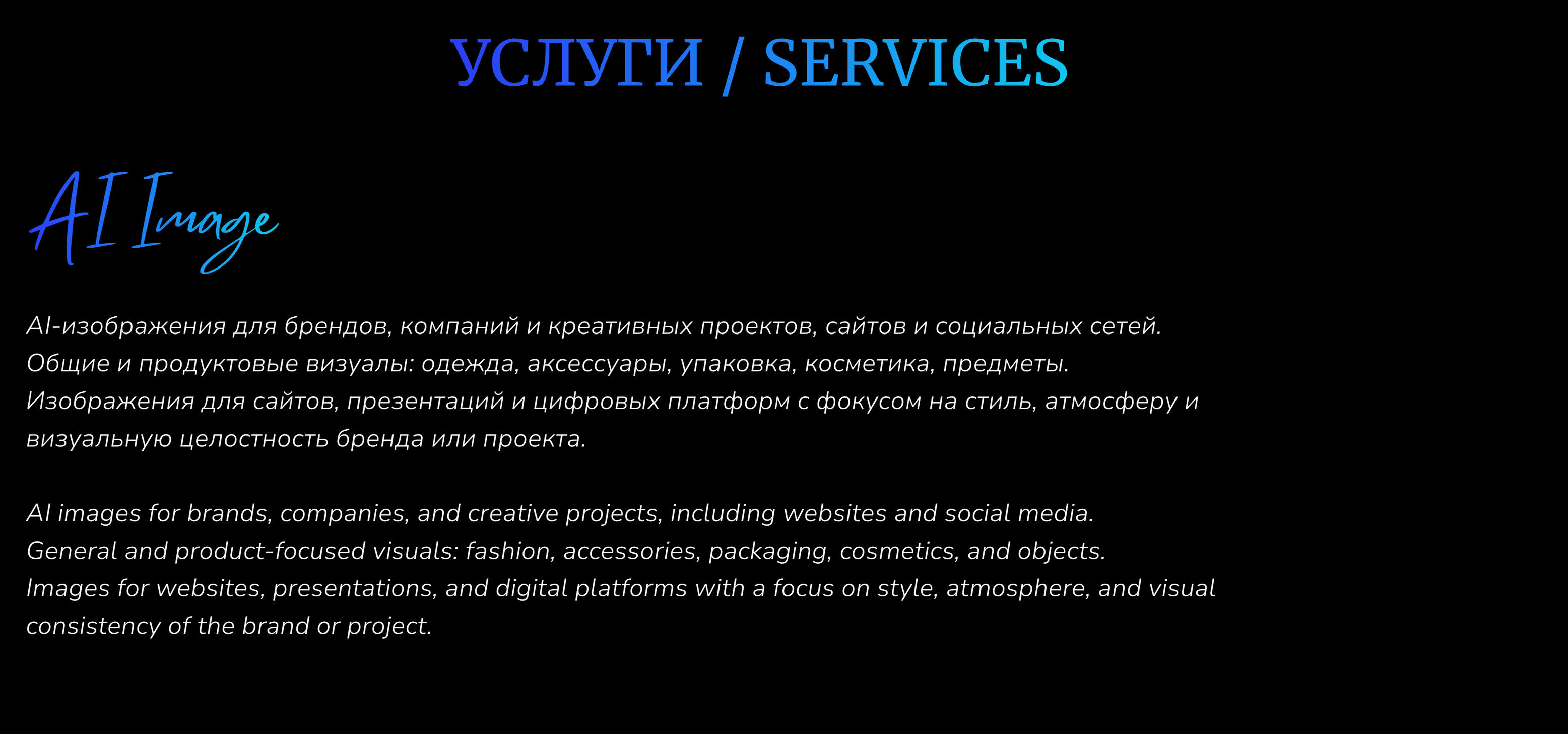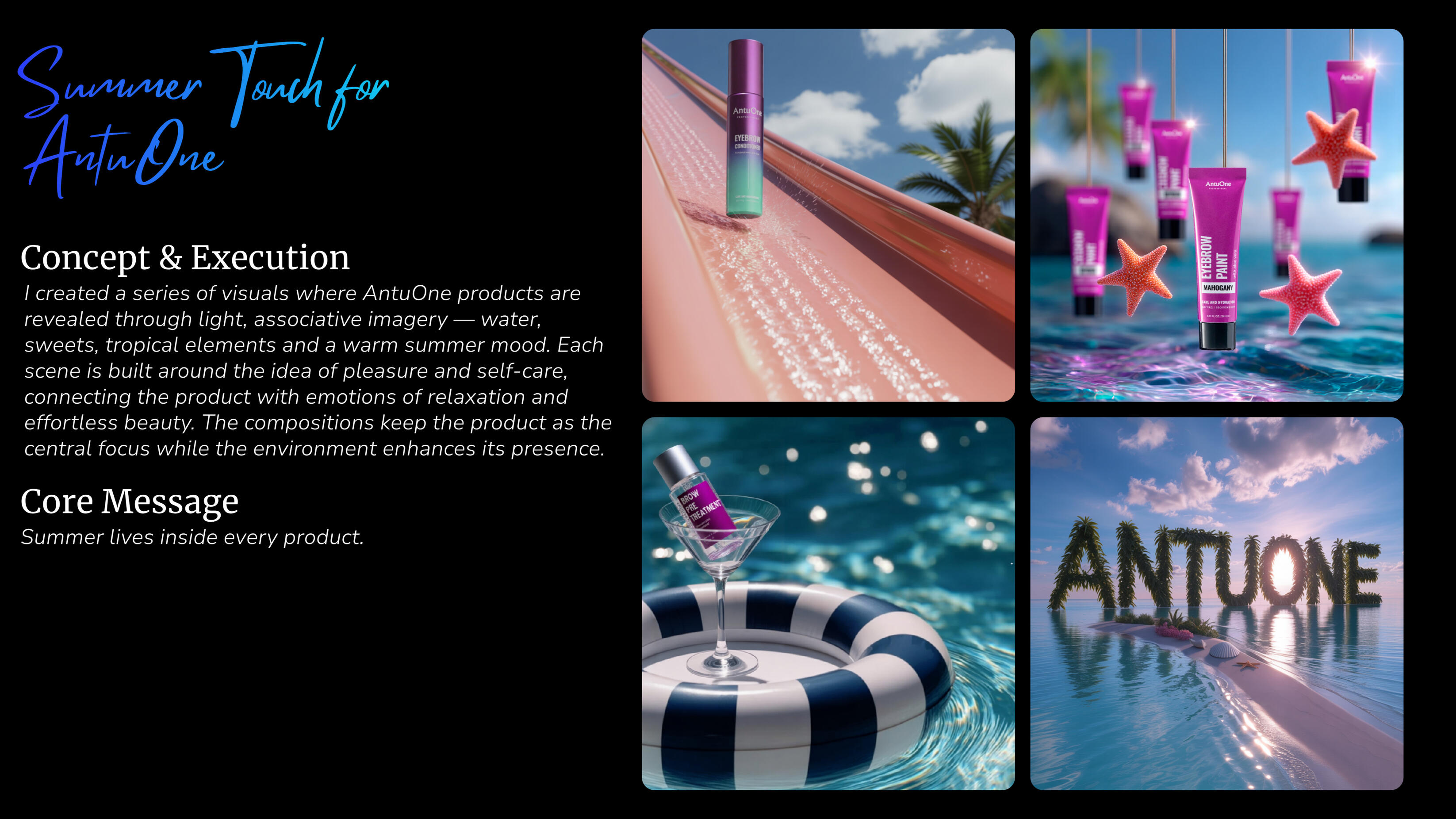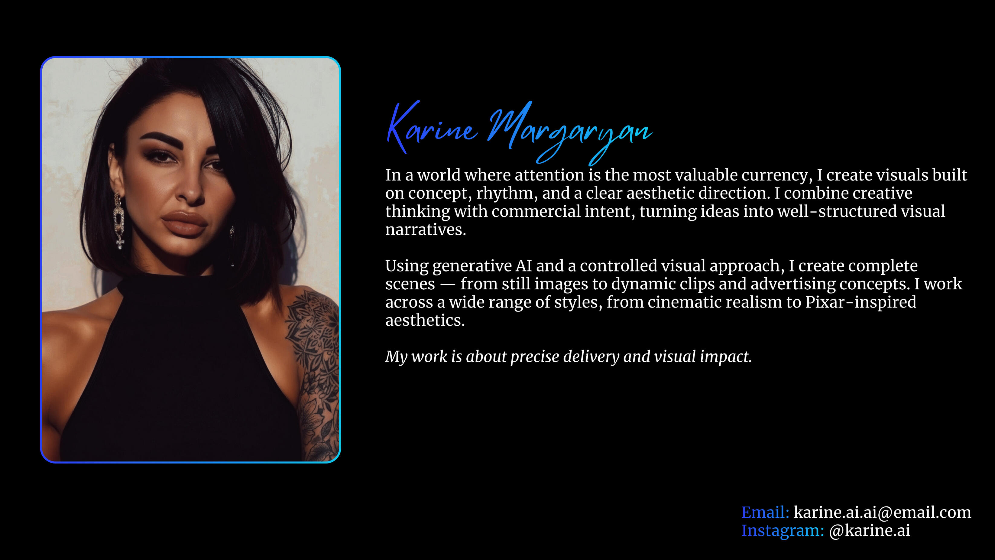 Используя генеративный AI и профессиональный подход к визуалу, я создаю цельные визуальные сцены — от статичных изображений до динамичных клипов и рекламных креативов.