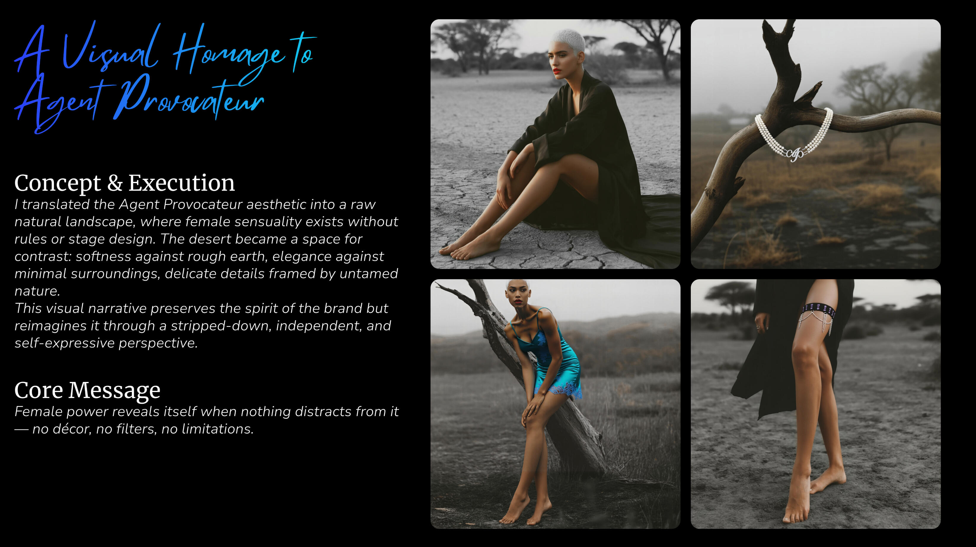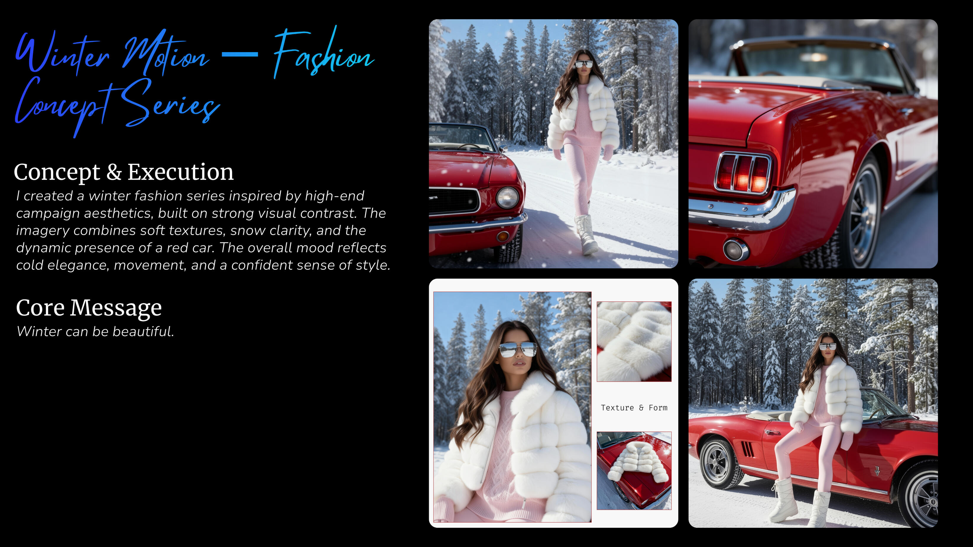 Используя генеративный AI и профессиональный подход к визуалу, я создаю цельные визуальные сцены — от статичных изображений до динамичных клипов и рекламных креативов.